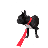 顔の大きいブヒに被せやすく抜けにくいハーフチョークを考えて、この形になりました。リードのナスカンに2個のリングを止めた時はハーフチョーク、1個だけを止めた時はチョークカラー。従来のチョークチェーンと異なり締まり過ぎることなく、首への喰いこみを防ぎ、サイズ調整をした長さで止まります。
